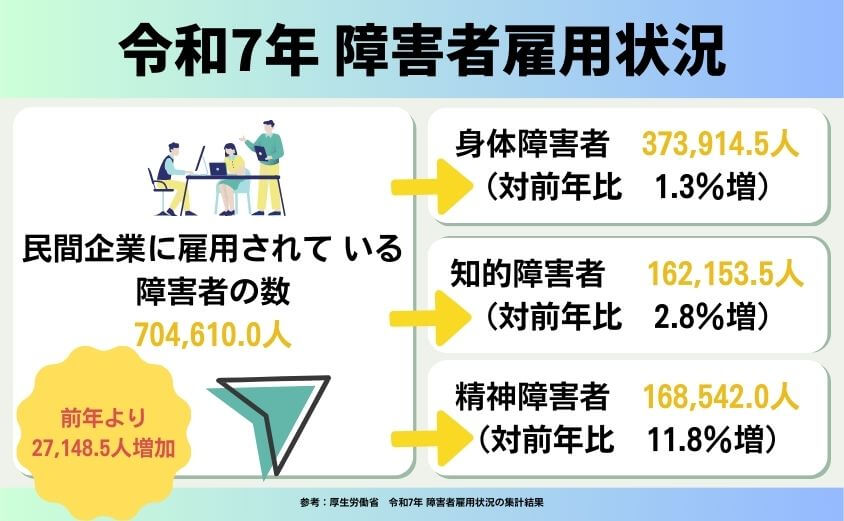 厚生労働省の「令和7年 障害者雇用状況の集計結果」によると、令和7年6月1日時点の身体障害者、知的障害者及び精神障害者の雇用状況は以下の通りです。